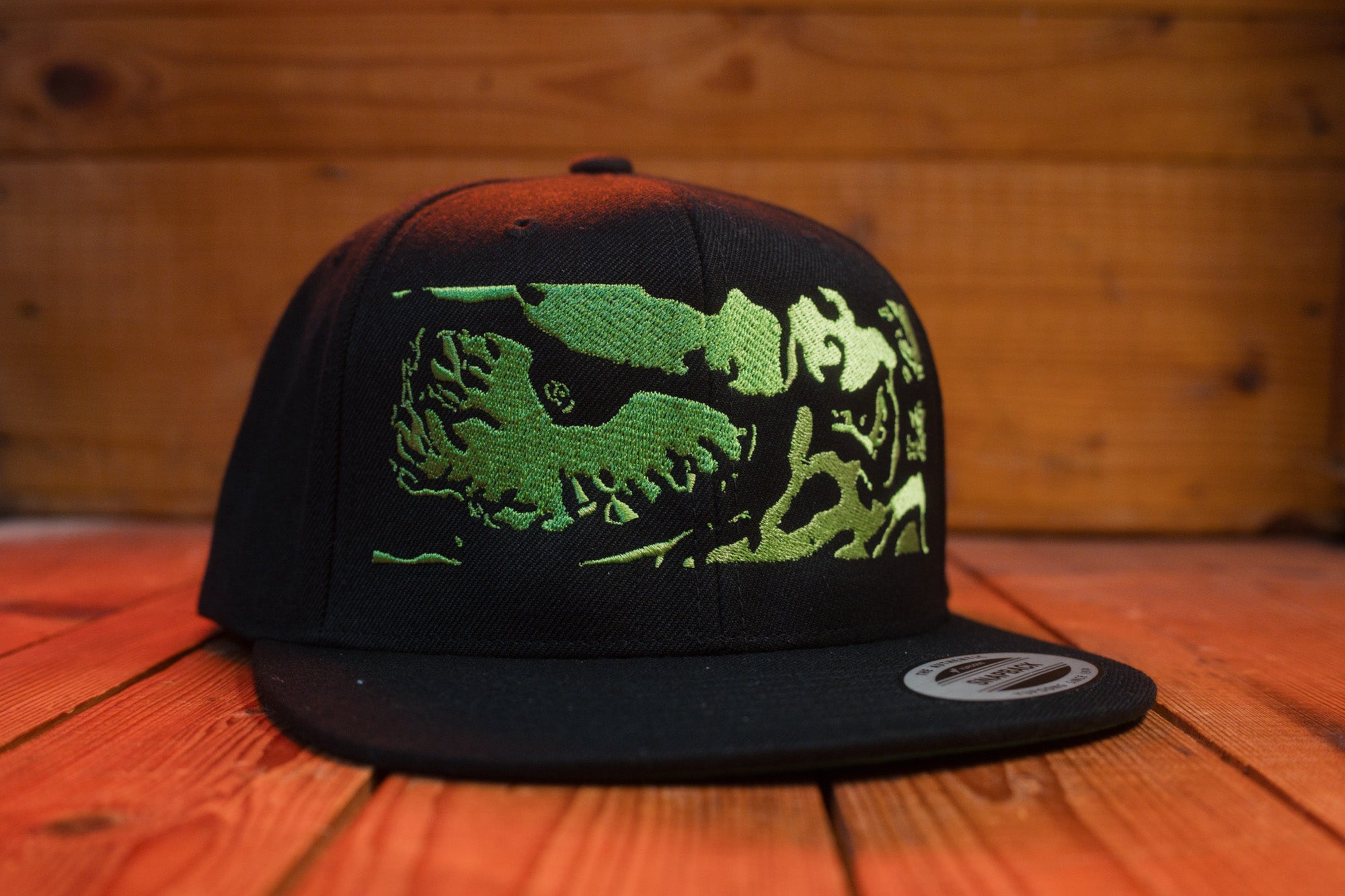 Rot never looked this good. This snapback brings the undead straight to your head with a bold, full-front embroidery that’s impossible to ignore. Neon-green stitching on black makes the artwork pop like something crawling out of the grave.