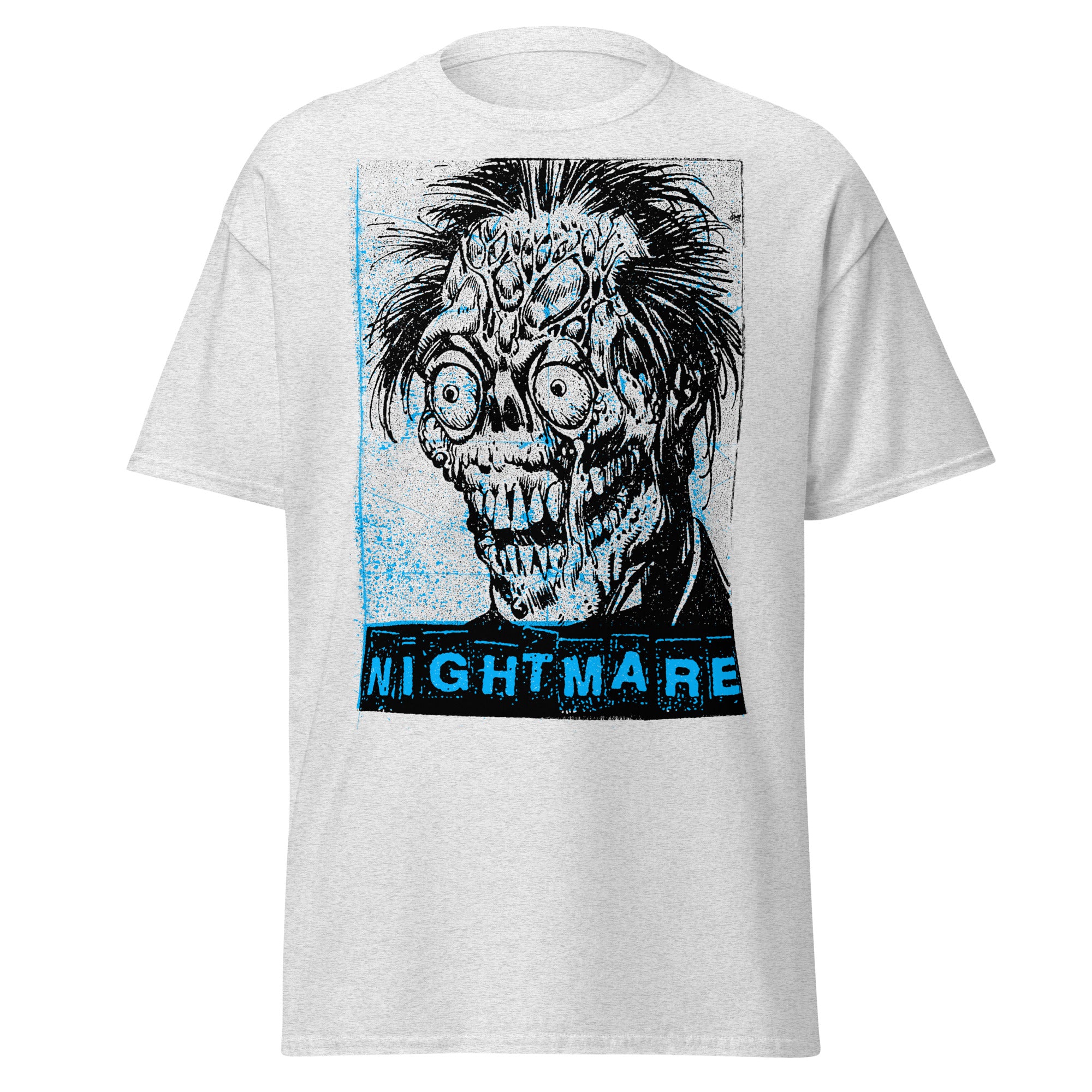 The Nightmare Tee is pure unhinged horror – a shrieking skull with wild, electrified hair and eyes that won't let you look away. It's got that raw, ink-blasted energy of an 80s horror comic ripped straight from the spinner rack, splashed in electric blue and served on soft ash grey. Think Creepshow meets underground punk poster, screenprinted in someone's basement at 3AM.