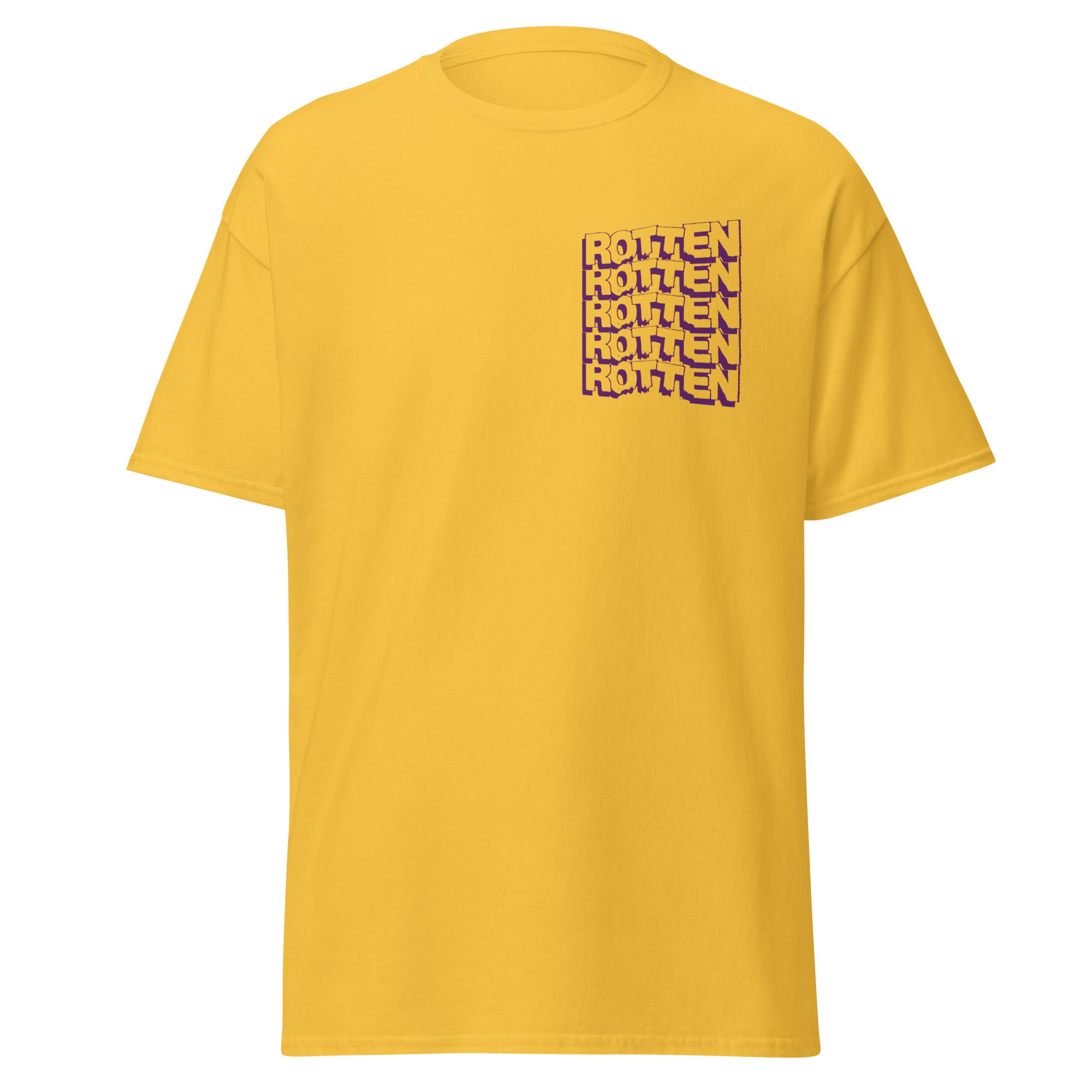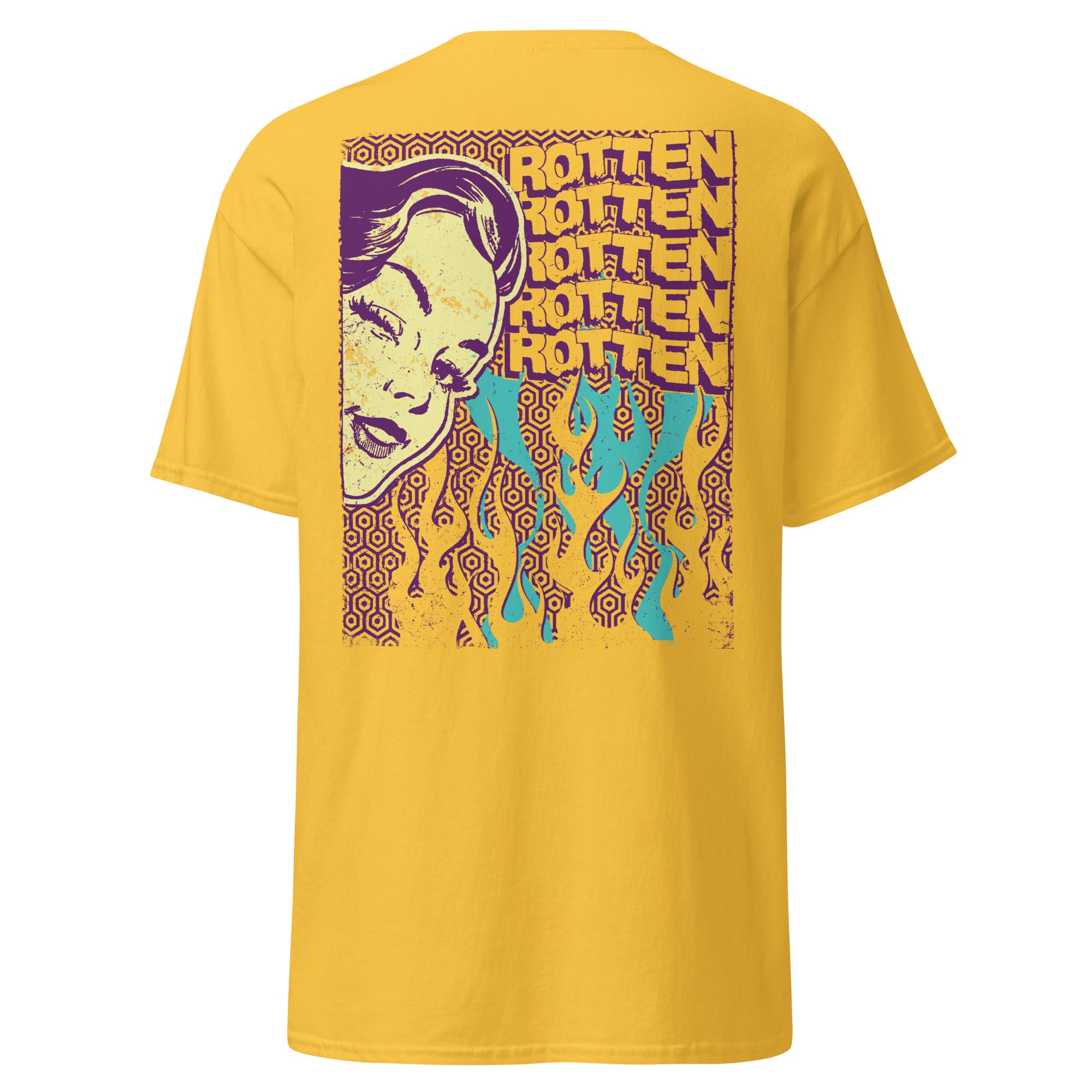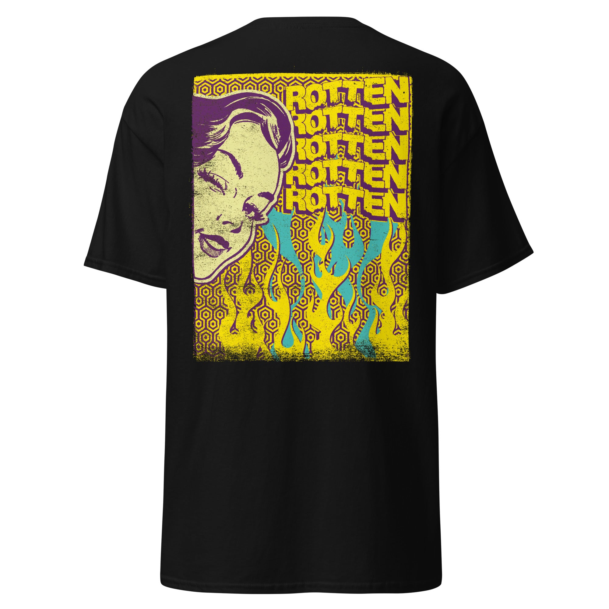 Some shirts whisper. This one screams ROTTEN—front and back. With a bold chest hit and a full back print that blends retro pulp vibes, fire, and chaos, it’s a design that refuses to fade quietly into the background.