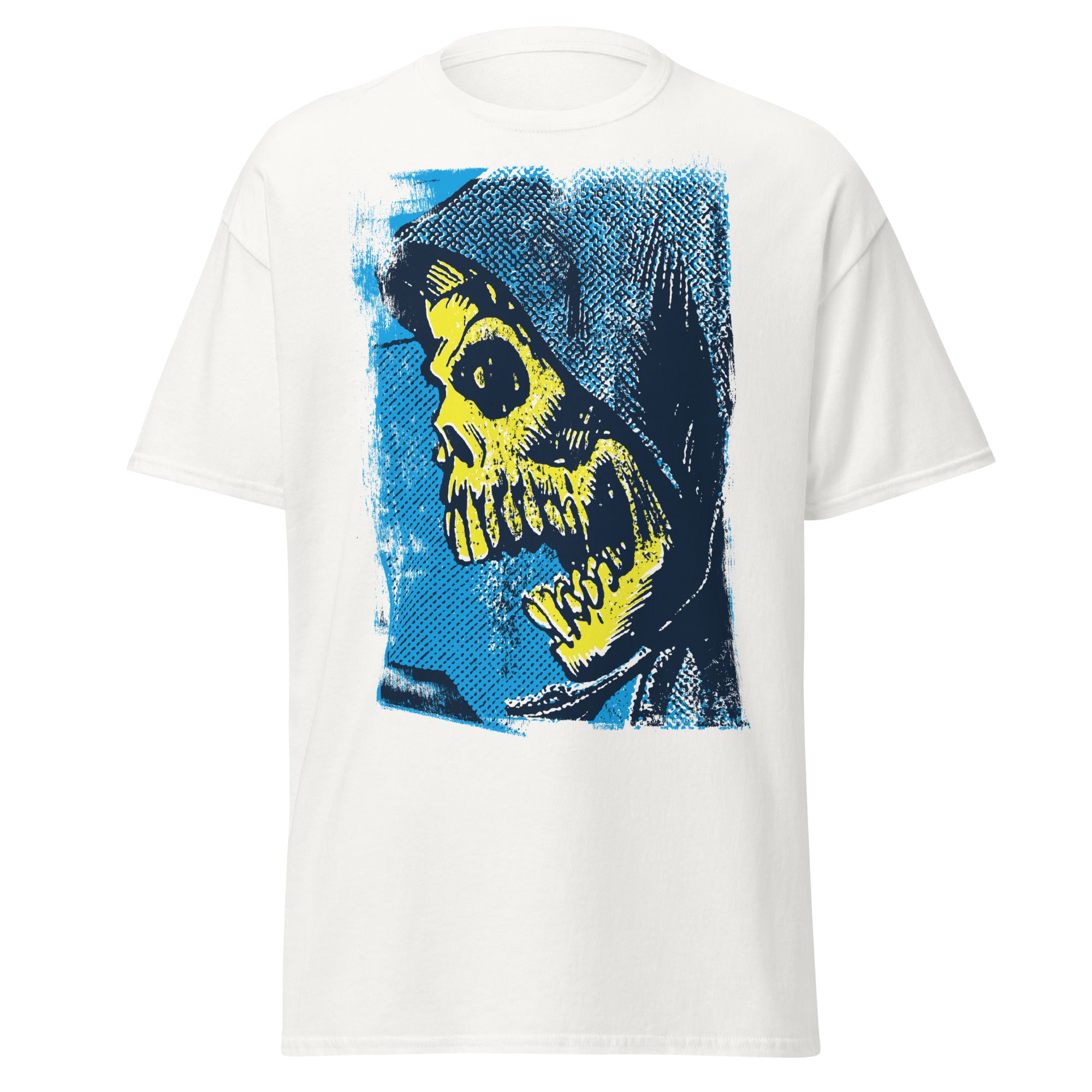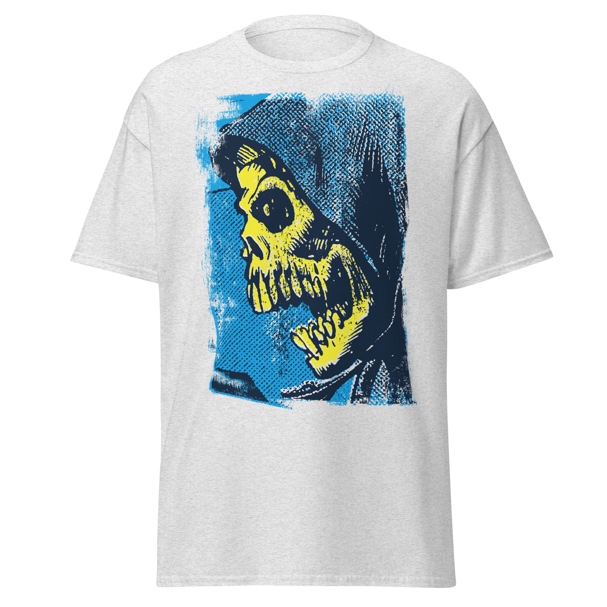 Some shirts whisper. This one screams. A grim reaper straight from a midnight comic book, splashed in electric blue and radioactive yellow. It’s eerie, bold, and made to haunt your closet forever.