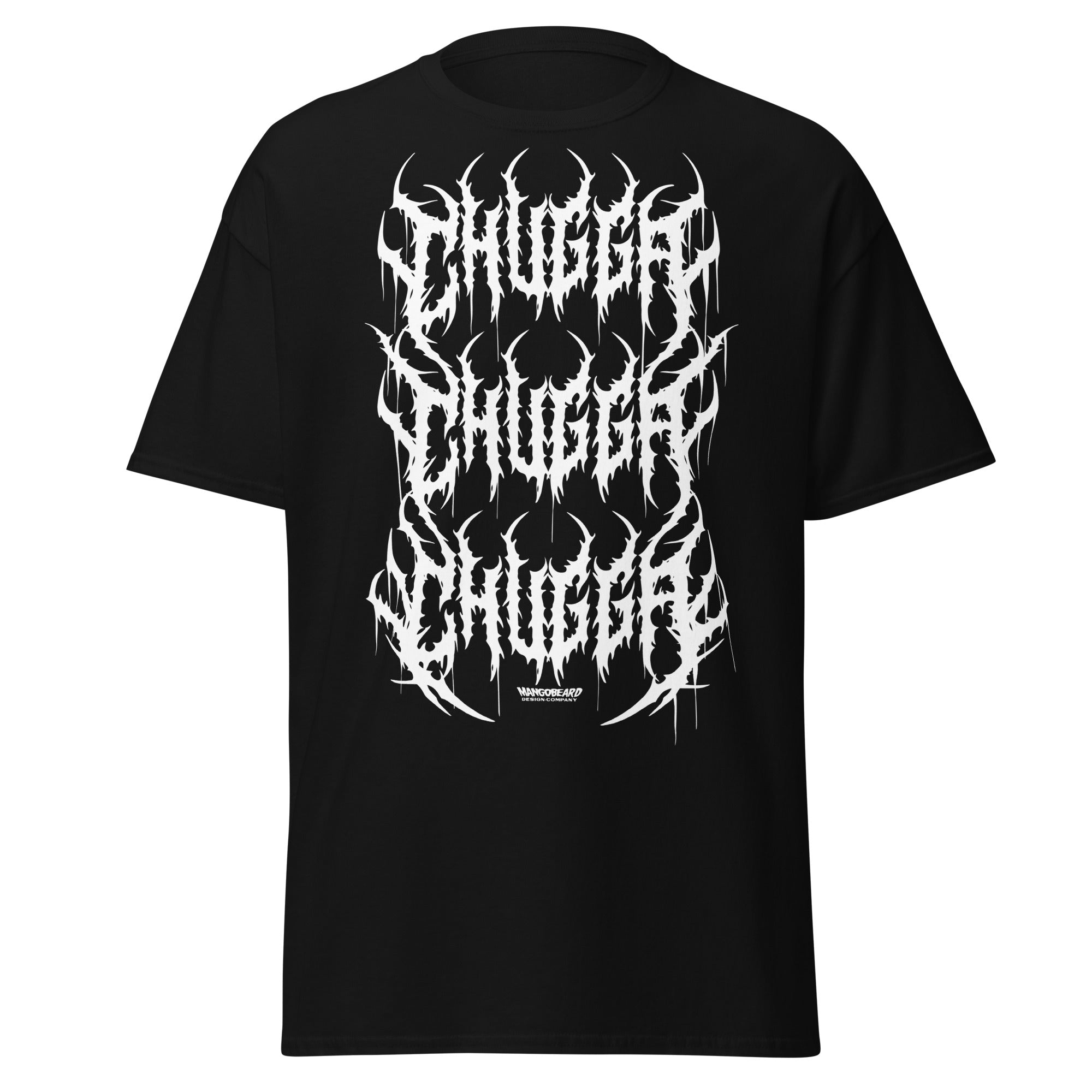 Blast beats. Breakdown riffs. A wall of distorted rhythm. This one’s for the pit-dwellers and riff worshippers. Featuring a triple-stack “CHUGGA” in obliterated deathcore typography, this shirt is pure sonic violence in cotton form.