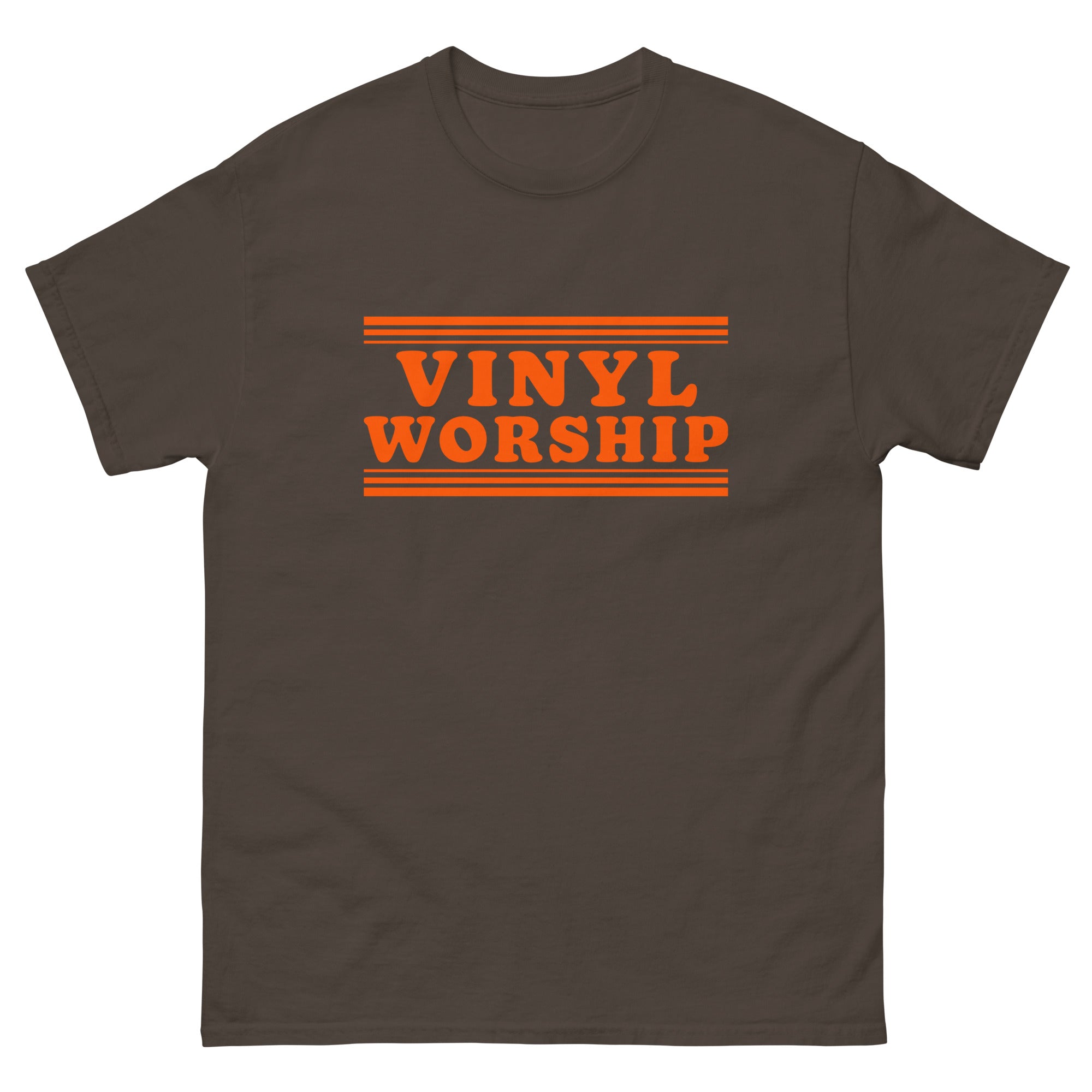 Turn the volume up and bow to the black wax. The VINYL WORSHIP tee is made for true analog disciples who know the needle never lies.